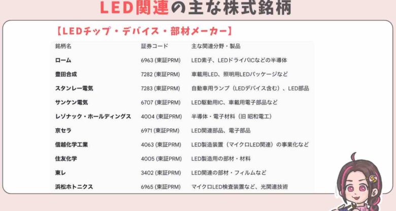 この3銘柄の他にもLEDの製造やデバイスメーカーがこちらです。