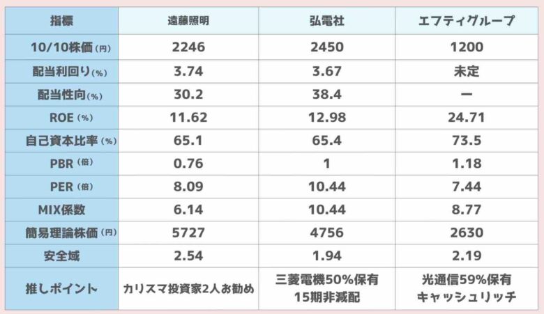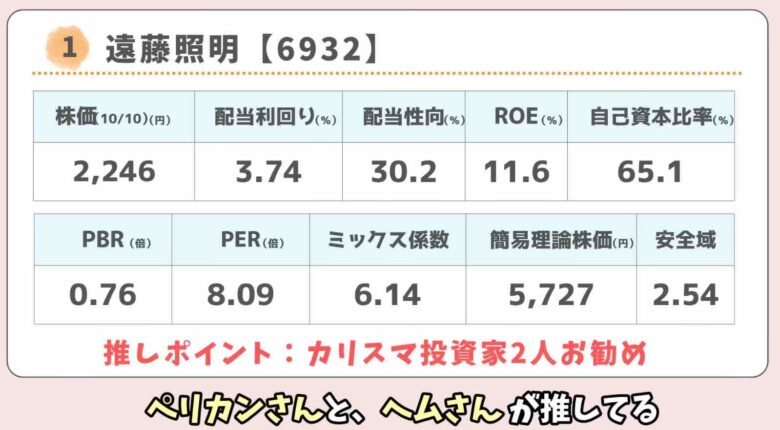 なんと言っても尊敬するカリスマ投資家、ペリカンさんとヘムさんが推奨している遠藤照明、株価指標は割安で、業績も好調です。