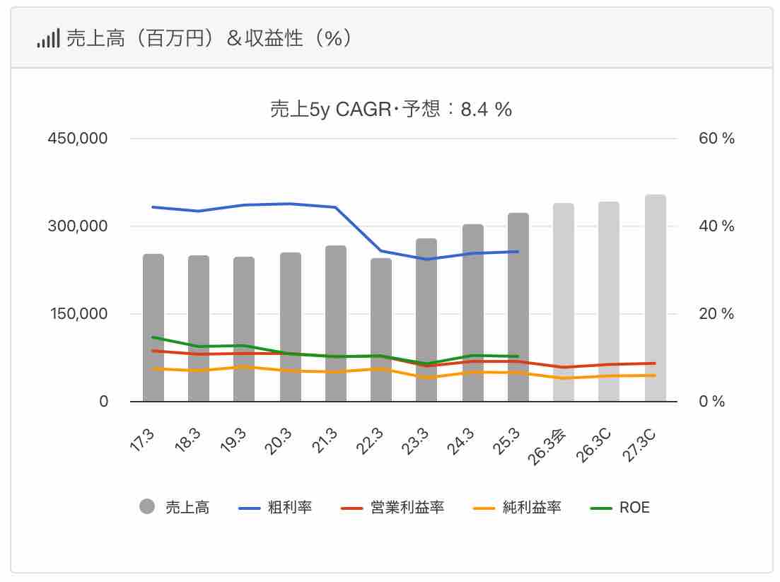 売上高は緩やかに上昇していますが、営業利益率はヨコヨコです。