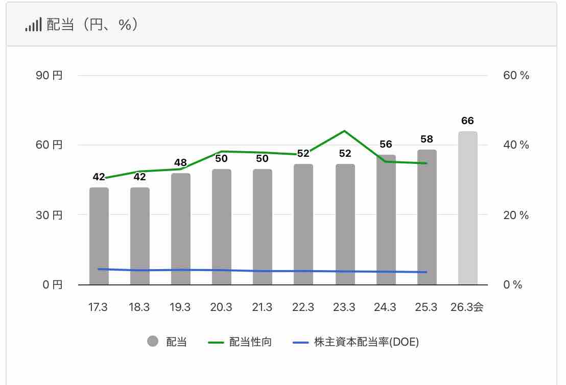 配当金の推移を見ると16期非減配で、現在株価2950円とすると配当利回りは2.23%、配当性向は47%です。
