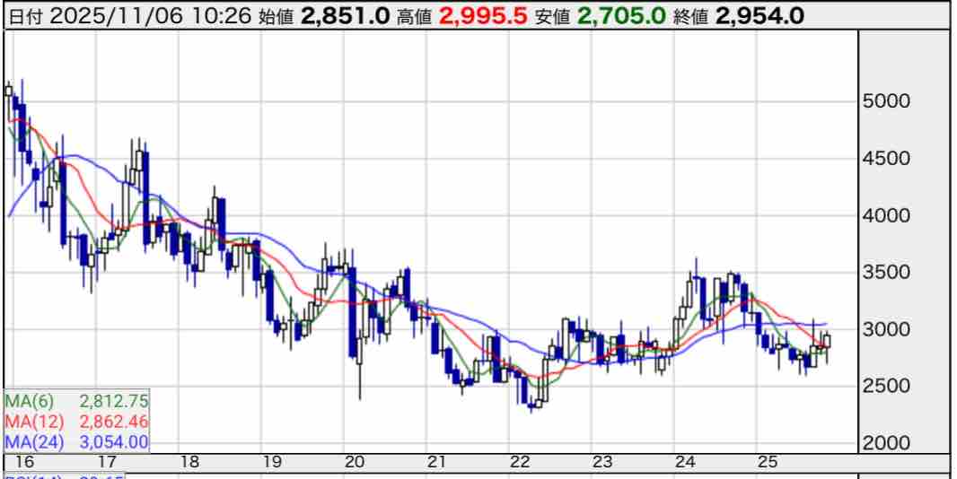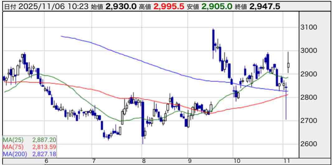 昨日の26年3月期第2四半期累計(4-9月)の連結経常利益は前年同期比29.8%減の103億円でした。しかし、6円の増配と株主優待の発表で株価が乱高下しています。