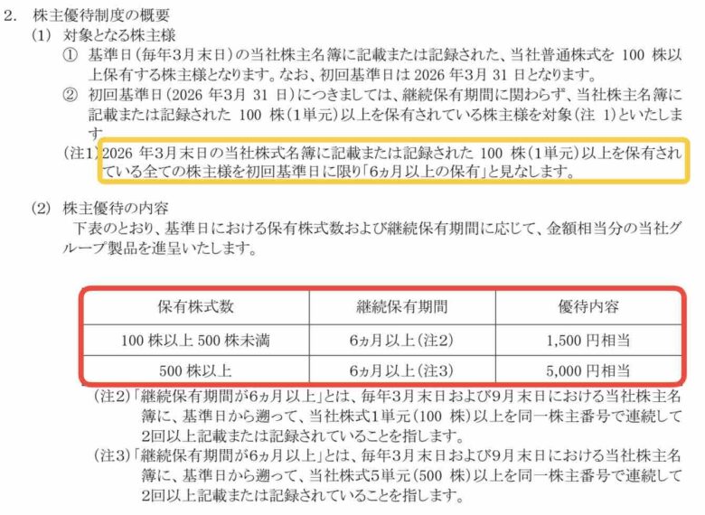 今回新設された株主優待は100株以上で1500円相当の自社製品です。初回2026年3月末権利に限り長期縛りはありません。来期からは6ヶ月以上保有の条件が加わります。