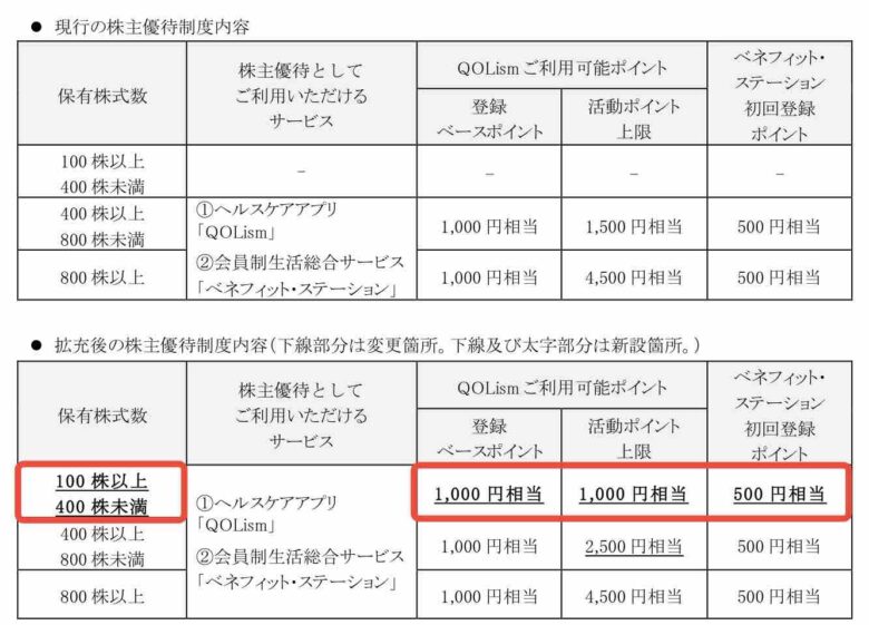 今回拡充された株主優待は、100株以上400株未満の枠でQOLismポイントが1000円分もらえます。
