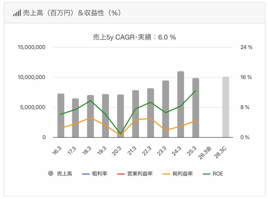 ROEが二桁もある稼ぐ力のある企業です。PBR1.3倍×PER12倍=ミックス係数15.6で株価指標は適正水準です。