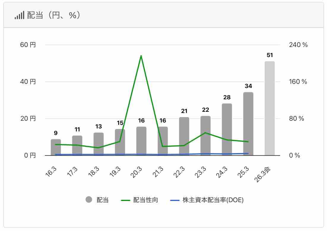 配当金は15期非減配です。今期は1株15円増配の51円を予定しています。