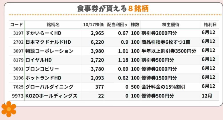 食事券がもらえる8銘柄がこちらです。kinkoは全く保有しておりません😅理由は配当利回りが低いのと主人がファミレスに行きたがらないためです💦