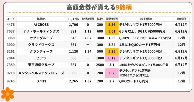 高額金券がもらえる9銘柄はこちらです。配当金を出さない代わりにデジタルギフトなどを優待として株主還元する企業が多いですね。私たち姉妹はビジョンの高額金券廃止で心が折れてから購入は控えています。