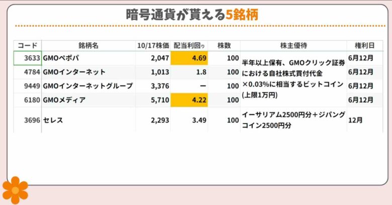 面白い優待は暗号通貨がもらえるもの。その5銘柄がこちらですが、GMOグループのビットコイン付与は0.03%と低いです。例えば、GMOペポパを100株買った場合の優待は61円くらいで0.00000376BTCしかもらえません。(10月20日価格)