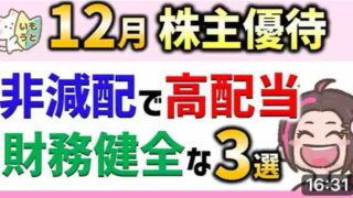 まだまだ12月権利の株主優待がたくさんあります。次回は、株高の今でも高配当で非減配な銘柄をご紹介したいと思います。