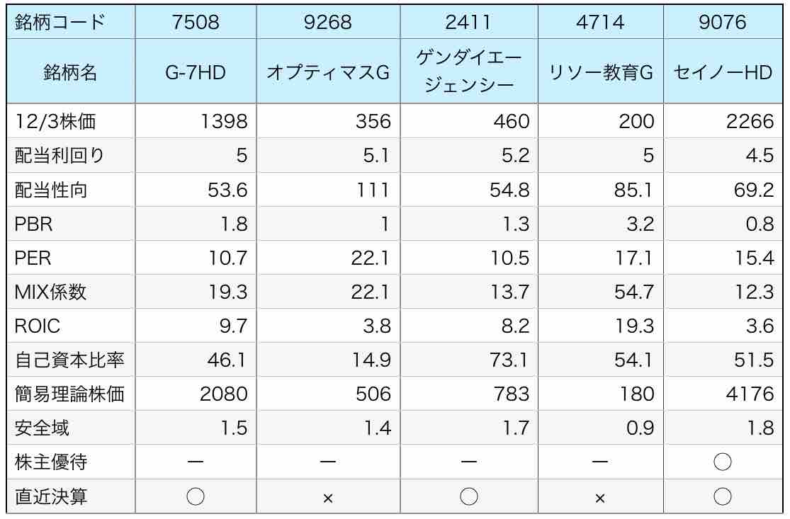 青枠はkinkoがすでに保有している銘柄です。その他まだ保有していない5銘柄の株価指標や業績等を一覧にしました。