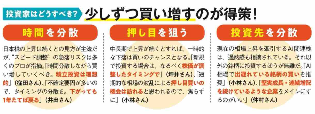 日本株の上昇が続くとの見方が大半なら少しずつ買い増していくのが得策だそうです。ほったらかしで市場の値動きを気にすることのない積立投資は、忙しいサラリーマンにはピッタリ♪4月のトランプショックのような調整局面で買い増しできれば理想的です。
