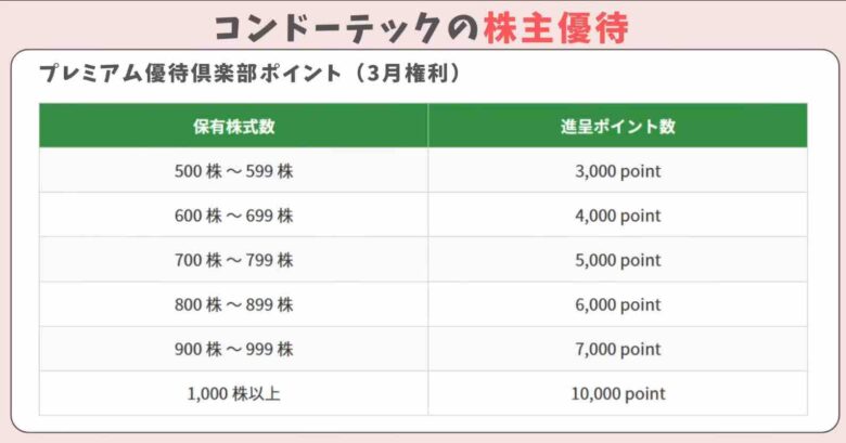 株主優待は500株以上でプレミアム優待倶楽部ポイントが3000Pもらえます。株数が増えるとポイント数も増えていきます。