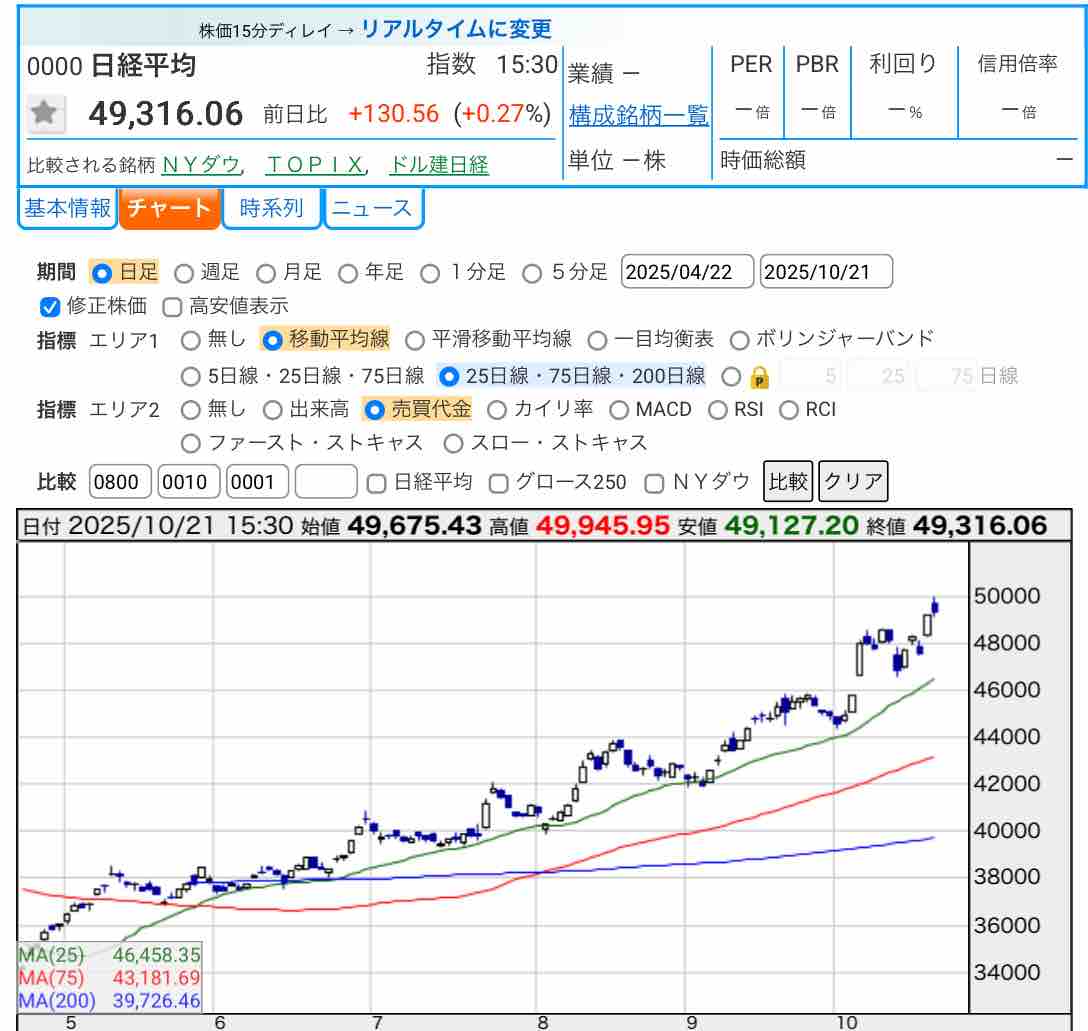 本日の相場は、高市総理大臣誕生期待で朝から上げ上げでした。高値は49,945円まで上昇し、あと少しで史上初の5万円…くぅ〜、惜しかった〜😆