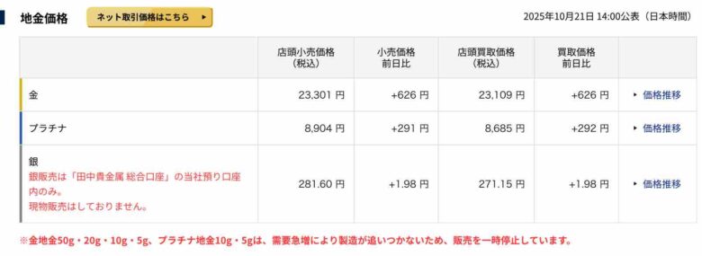 前回、20gの現物の金が売り切れだったのに、今は50g、10g、5gも販売中止になっています。