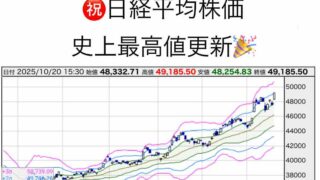 本日の相場は、高市総理大臣誕生期待で朝から上げ上げでした。高値は49,945円まで上昇し、あと少しで史上初の5万円…くぅ〜、惜しかった〜😆