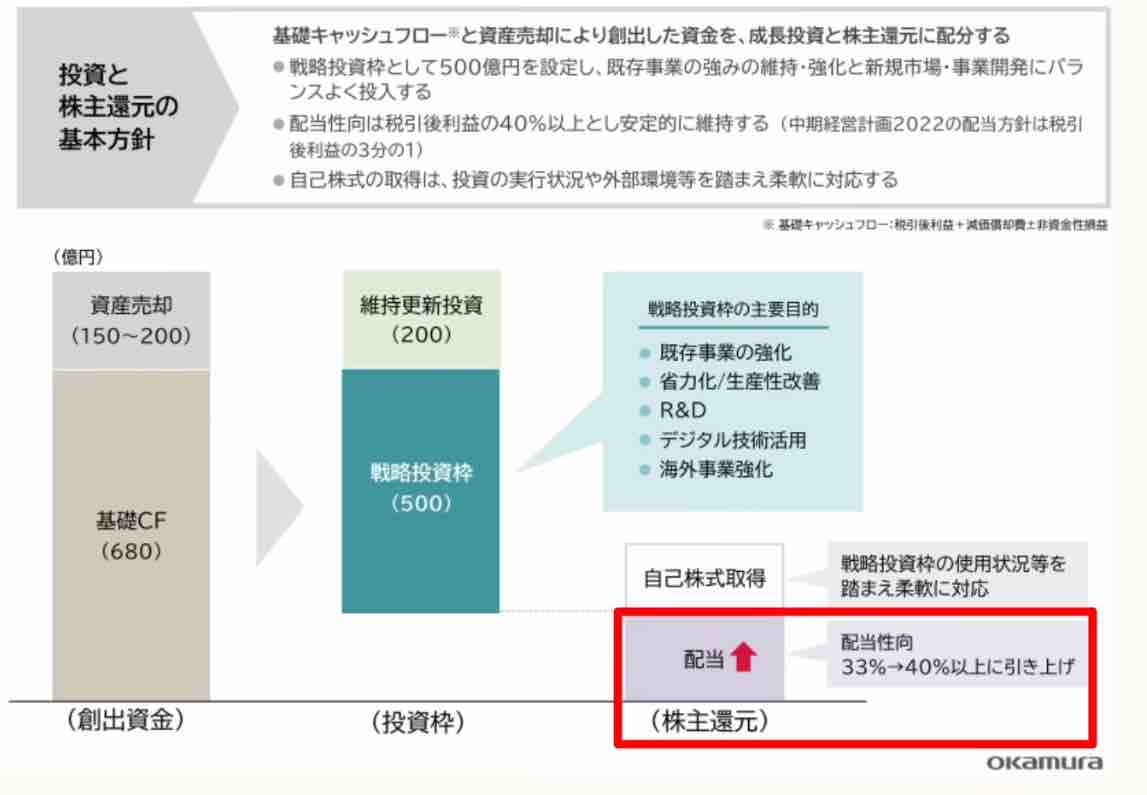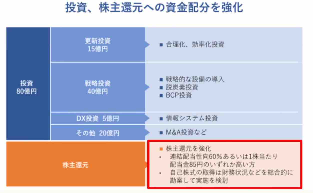 中期経営計画の株主還元方針は下限配当1株85円配当性向60%のいずれか高い方と明記しています。