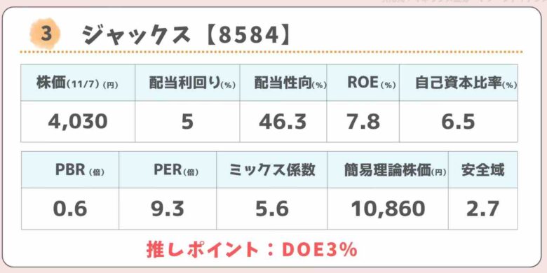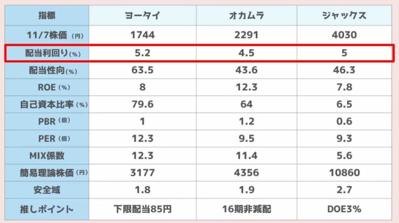 動画内で紹介している3銘柄がこちらで、配当利回りが4.5〜5.2%もあります♪