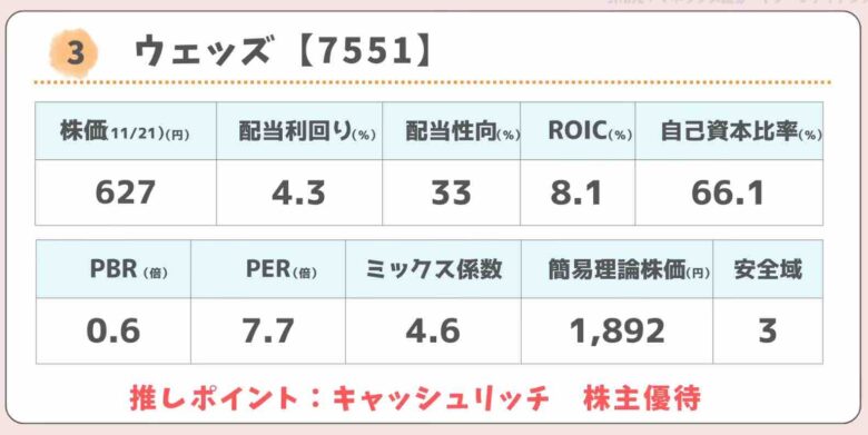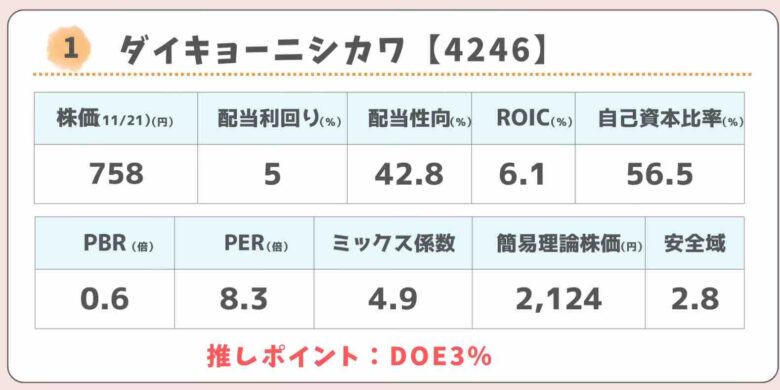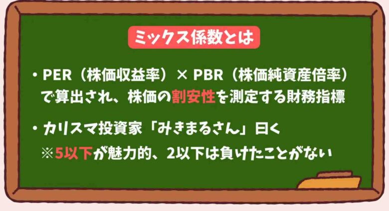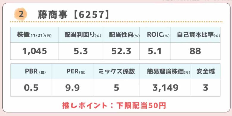 ミックス係数4.9と割安で、稼ぐ力のROIC6.1%もあり、平均4.5〜5.4%を上回っています。