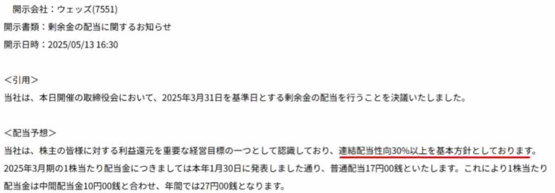 株主還元方針は連結配当性向30%以上を基本方針としています。業績によって配当金が上下しそうですね。