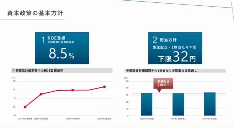 中期経営計画で下限配当1株32円とし累進配当を発表しています。