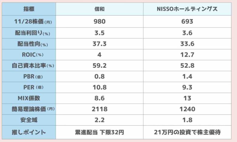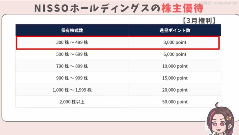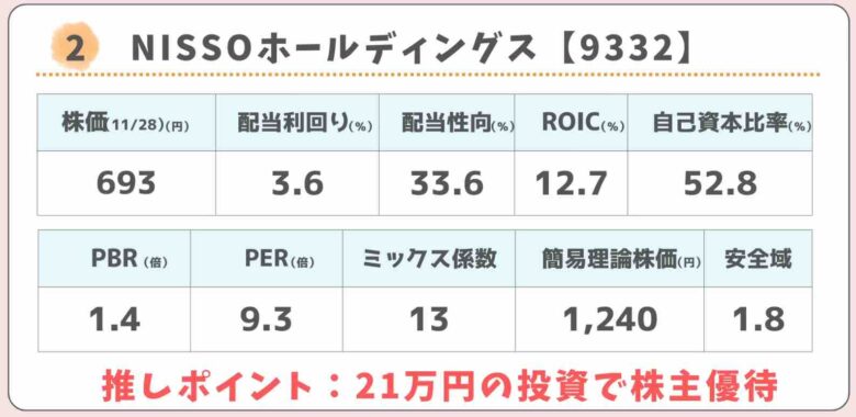 NISSOホールディングスは300株から投資資金20万円程度でもらえます。総合利回りにすると5%を超えます。