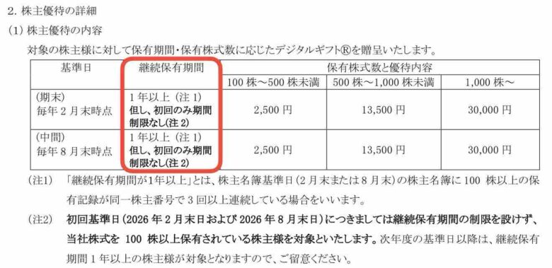 今回新設される株主優待は、100株以上でデジタルギフト2500円分が年2回もらえます(年間5000円分)。2月末と8月末権利で、今年のみ長期保有縛りがありません。来年以降は1年以上保有の条件が付きます。