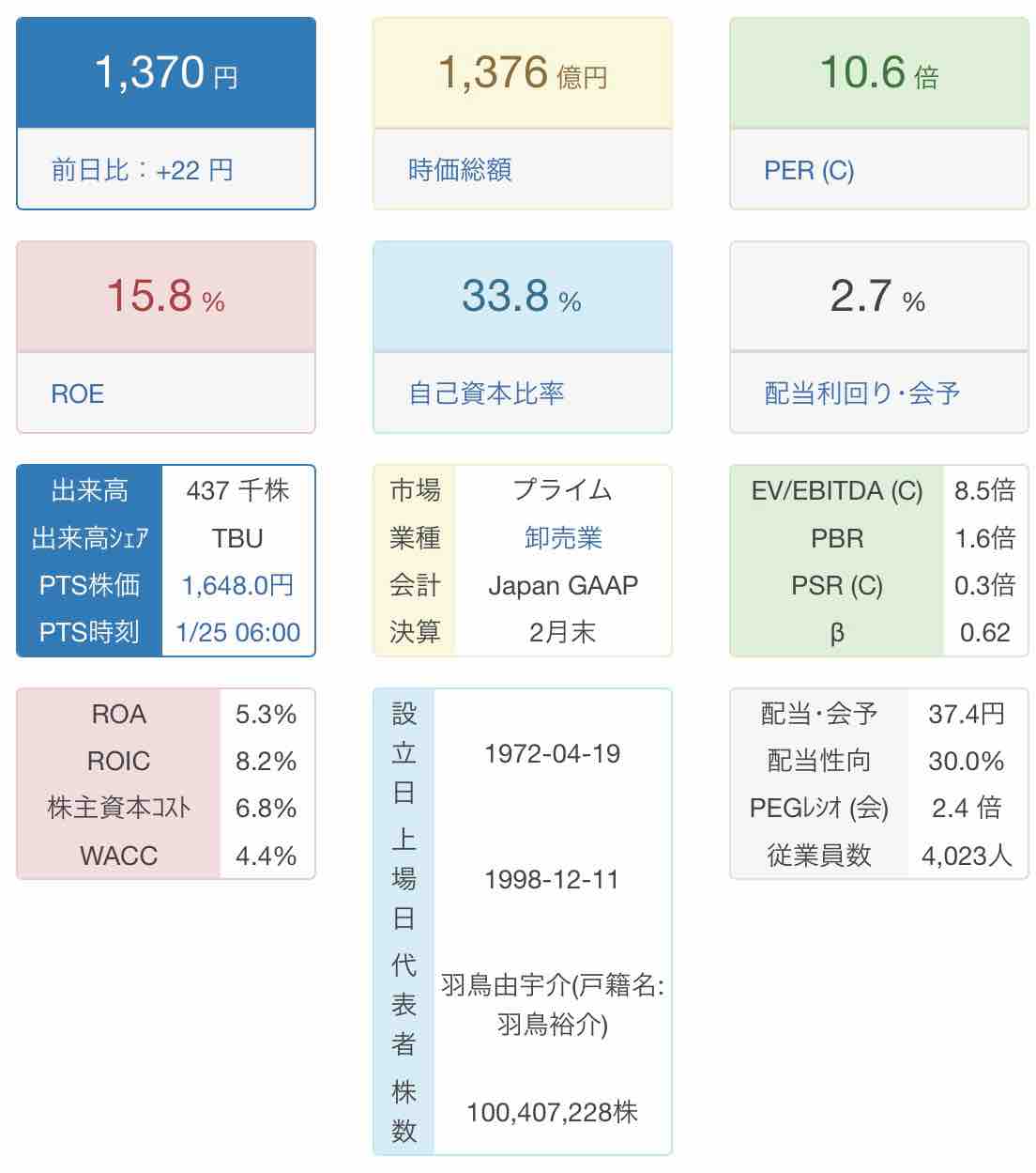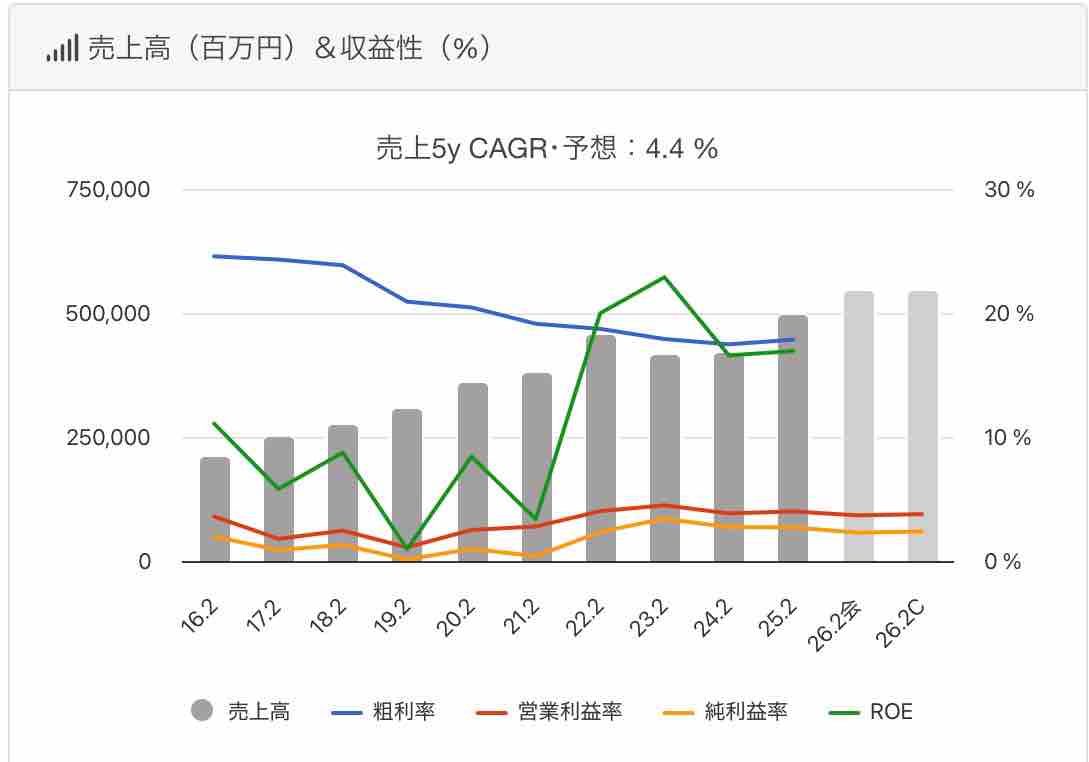 自己資本比率が33%と低く、有利子負債倍率1倍以上多いのが懸念点です。ROIC8.2%、ROE15.8%と稼ぐ力のある企業です。PBR1.6倍、10.6倍で株価指標は、ほぼ適正といったところでしょうか。