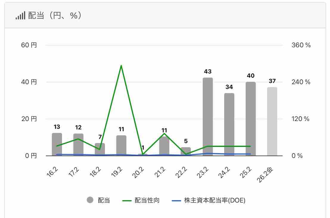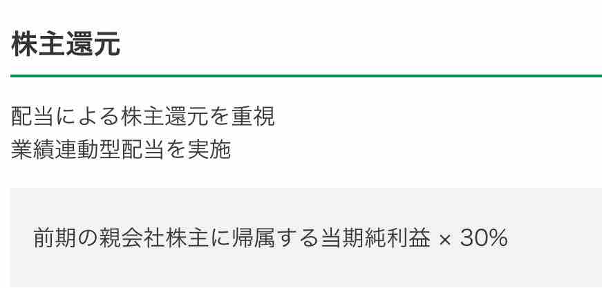中期経営計画の配当方針は、業績連動型で配当性向30%です。業績により左右されるので安定配当ではありません😅