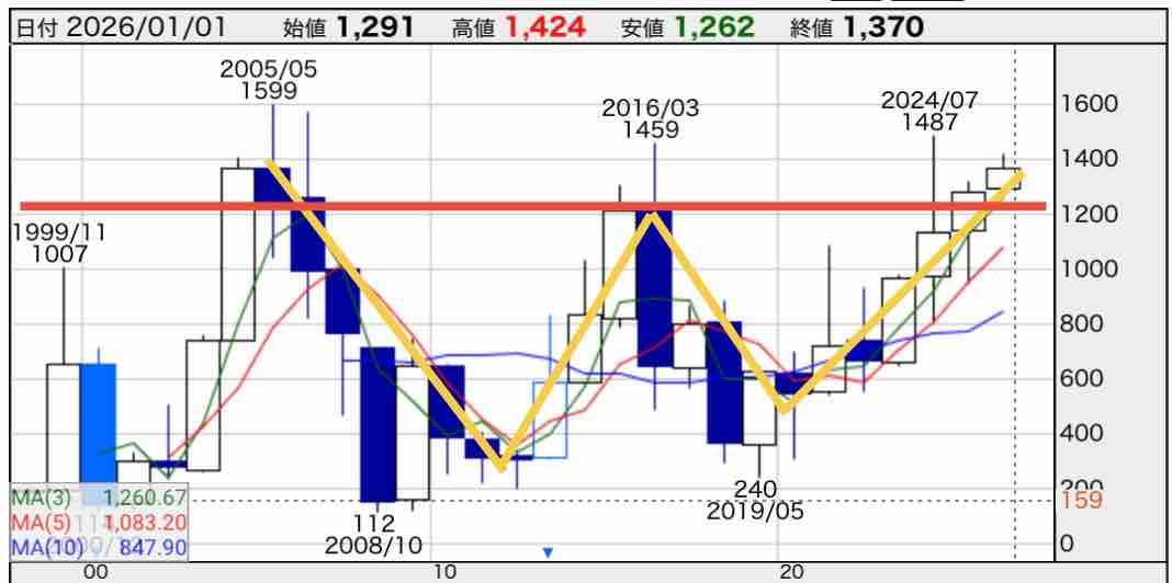 年足チャートではダブルボトムをつけ、ネックラインをブレイクアウトしたので長期の上昇トレンドへ入ったように見えます。