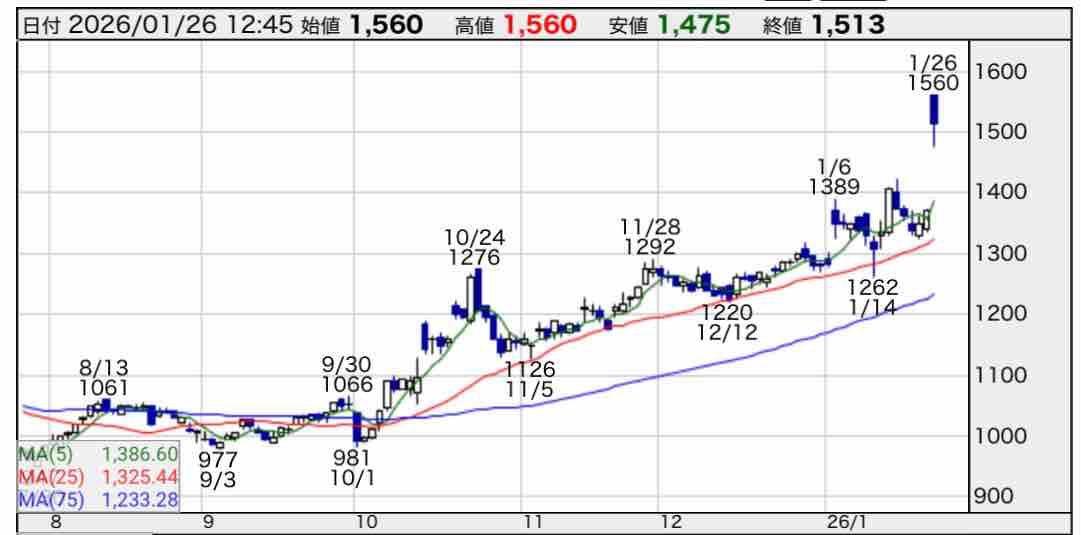 日足のチャートは、株主優待新設の発表を受け10%以上上昇しています。