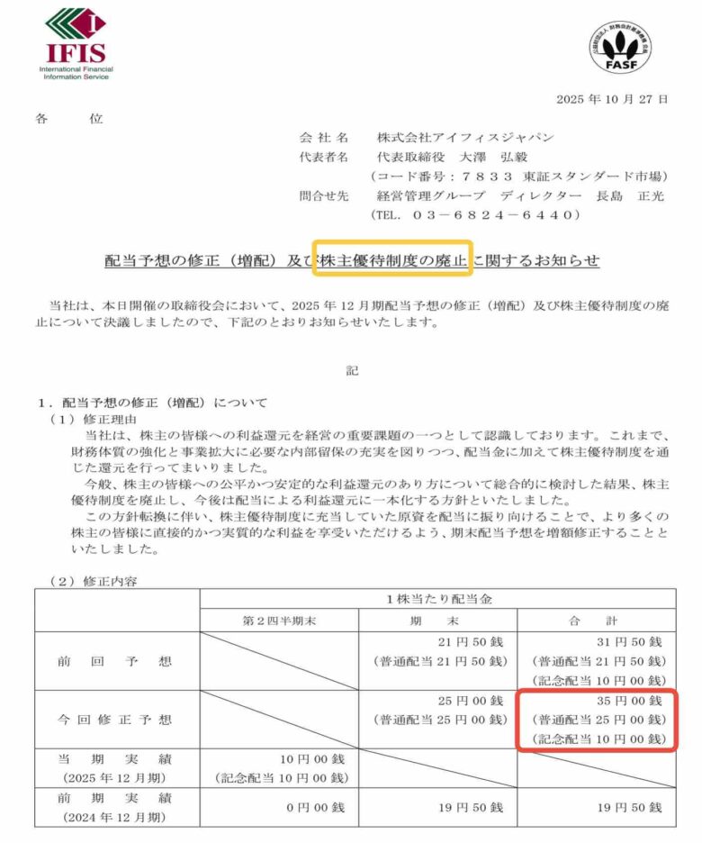 ⚡️株主優待廃止⚡️【7833】アイフィスジャパンが配当金重視へ