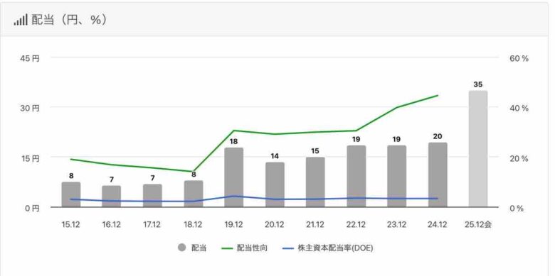 その分を配当金へ還元するそうで、今期は1株31.5円→35円3.5円増配と発表しています。