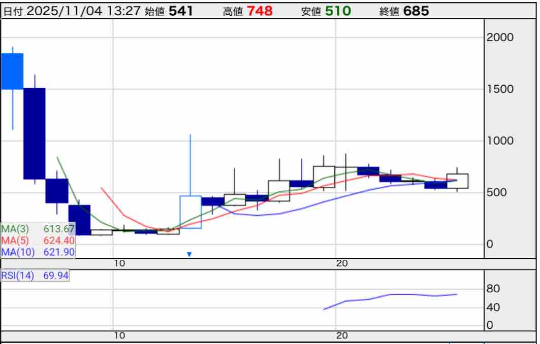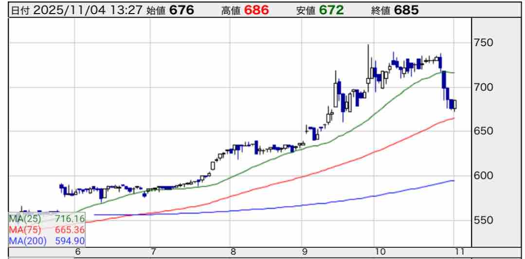 日足のチャートは株主優待の廃止を受けて10%ほど下落しています。
