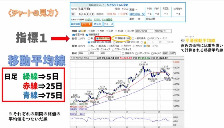 平滑移動平均線は直近の株価に比重を置いて計算される移動平均線です。これを使ってできた指標がMACDです。移動平均線には出ていないゴールデンクロスやデットクロスが出ています。