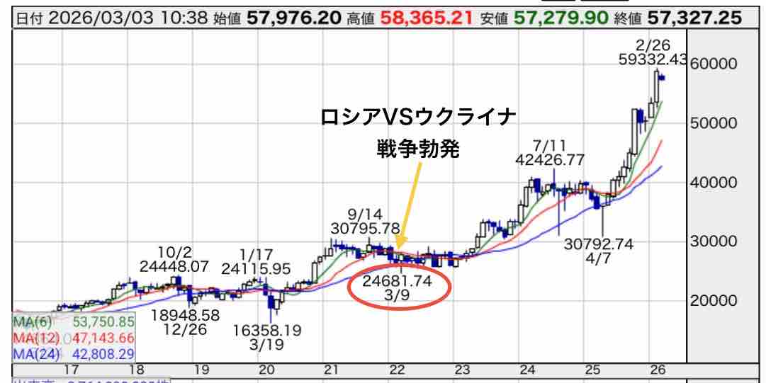2022年2月にロシアVSウクライナの戦争が始まりました。戦争は4年も経つ現在でも続いています。日経平均株価のチャートを見ると翌月の3月に底を打ち反転上昇しています。