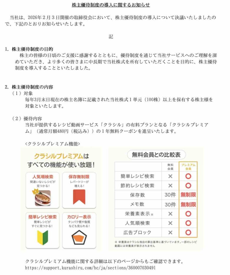 【新設株主優待】料理動画配信サービスの【299A】クラシルが有料プランの1年間無料クーポン進呈へ!