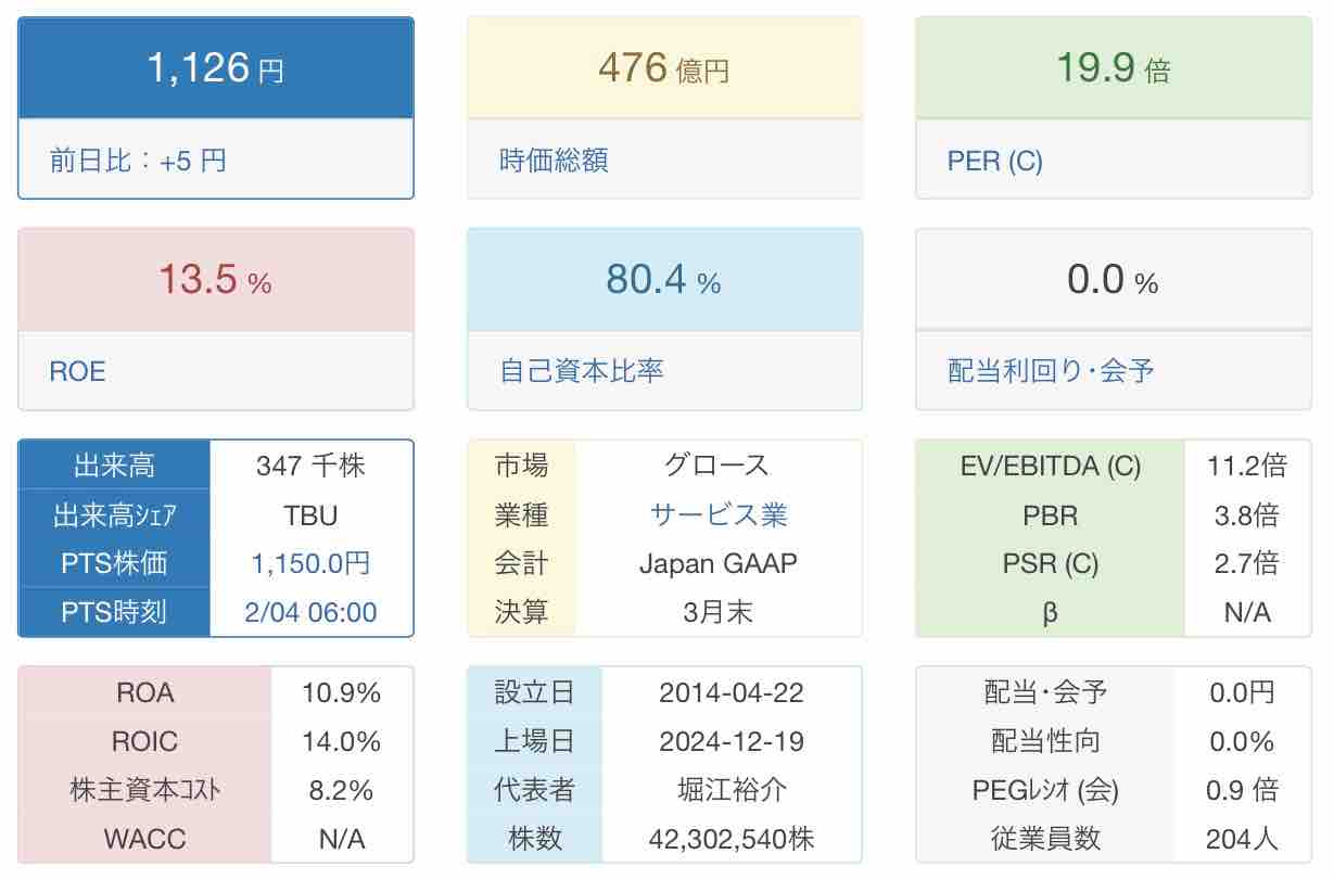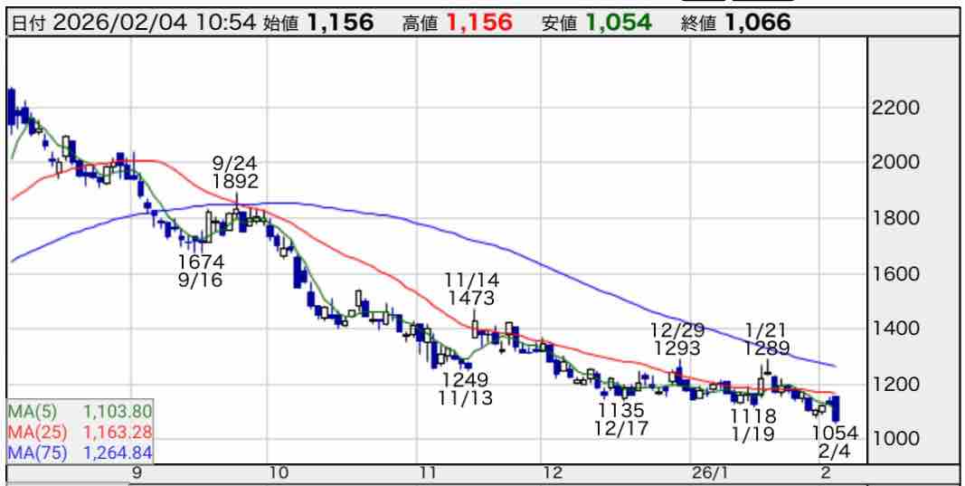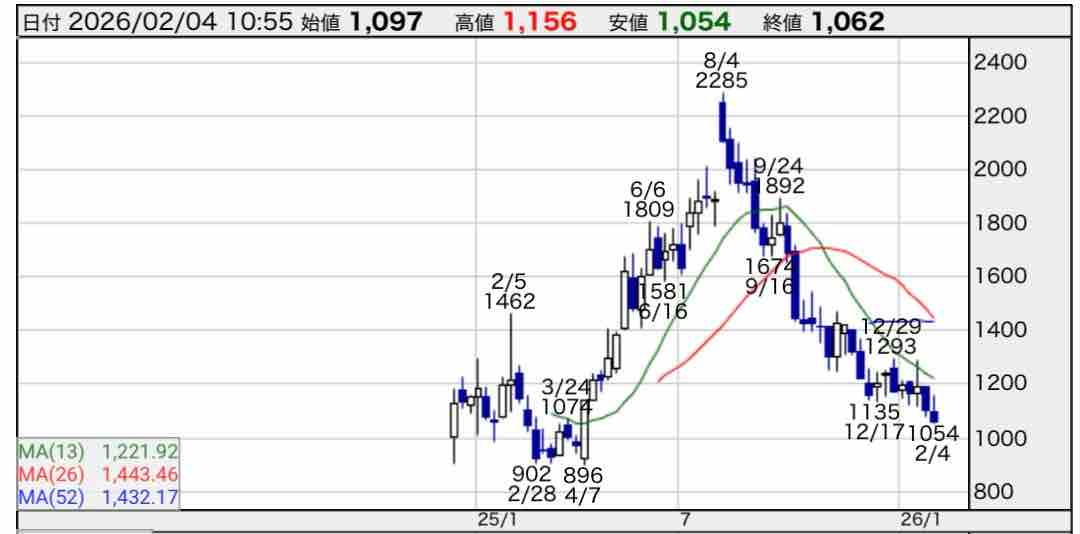2024年12月に上場、公開価格1200円のところ始値は公募割れの1001円でした。昨年8月高値2285円から株価は半値以下になっています。
