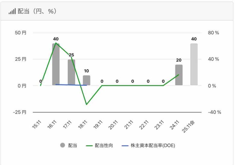 配当金の推移を見ると、全く安定していません💦今期は前期の1株配当20円に加え特別配当として20円を上乗せして1株配当40円を予定しています。