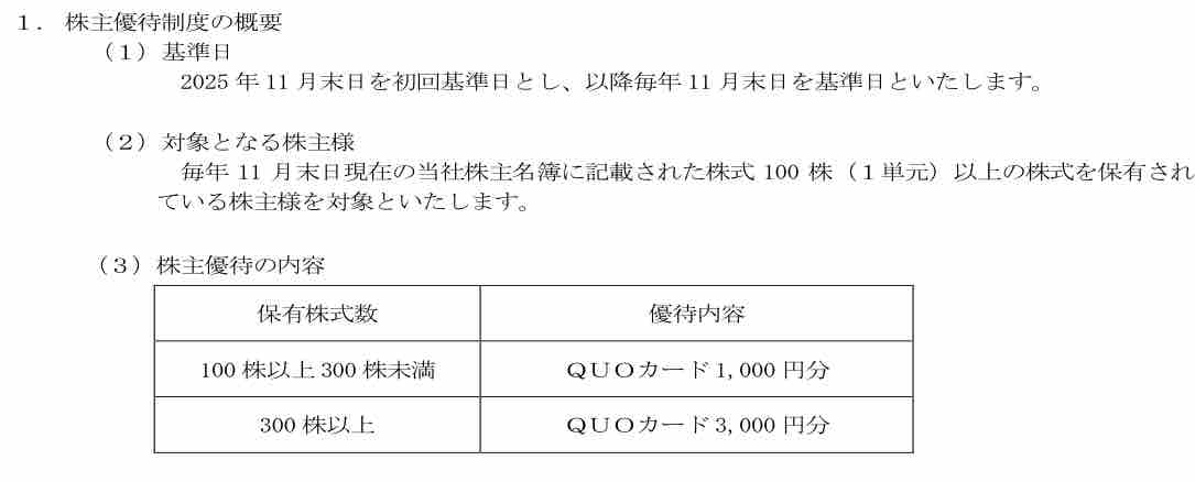 今回新設された株主優待はkinko大好きQUOカード❤️100株以上保有で1000円分がもらえます♪300株以上では3000円分、11月末権利です。