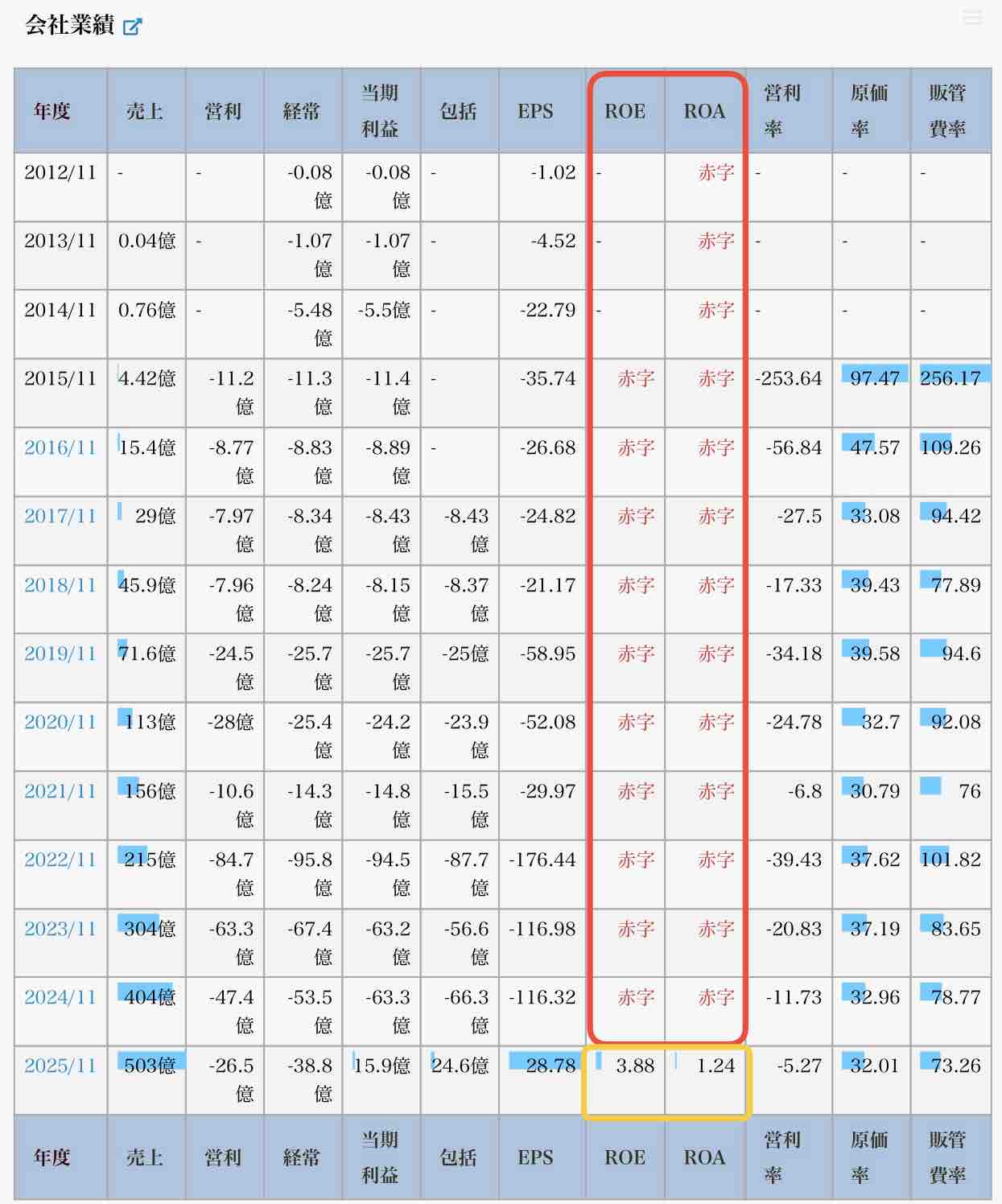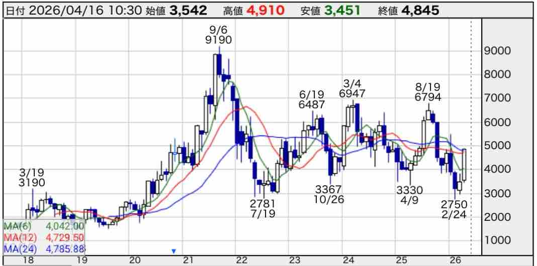 月足チャートを見ると上下が激しく、ここ4、5年は株価3000円〜6000円のレンジ相場でした。グロース市場って赤字でもこんなに株価が高いんですねー😳