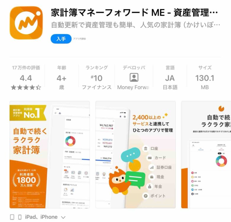 家計管理から資産運用までできる「家計簿マネーフォワードME」というアプリがあり、評価4.4と高く人気です。