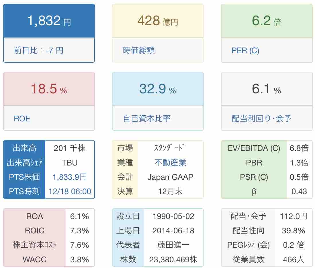 自己資本比率32%は不動産業の平均くらいです。PERの6.2は割安すぎではないでしょうか?ミックス係数8、ヘムさん式簡易理論株は4057円で安全域2.2なのでこちらも割安水準です。