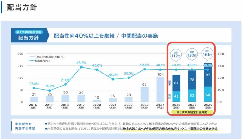 それがこちら、今期1株配当112円→来期130円→再来期161円と明確にうたっているんですよねー😳