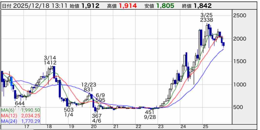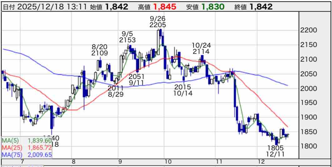日足のチャートを見ると、9月の高値から約2割ほど株価が下がっています。
