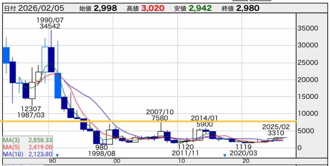 ちなみに年足チャートに今回のTOB価格を黄色線で引いてみると、バブル期の株価には遠く及ばないというのがわかります💦