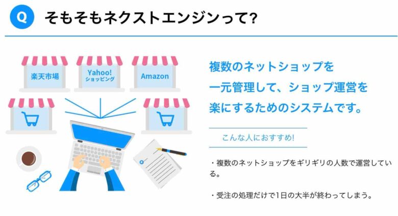 NEはEC支援SaaS「ネクストエンジン」を運営している企業です。複数のネットショップを一元管理してショップ運営を楽にするためにシステムです。ネクストエンジンを利用しているユーザーは6500社もいるようです。