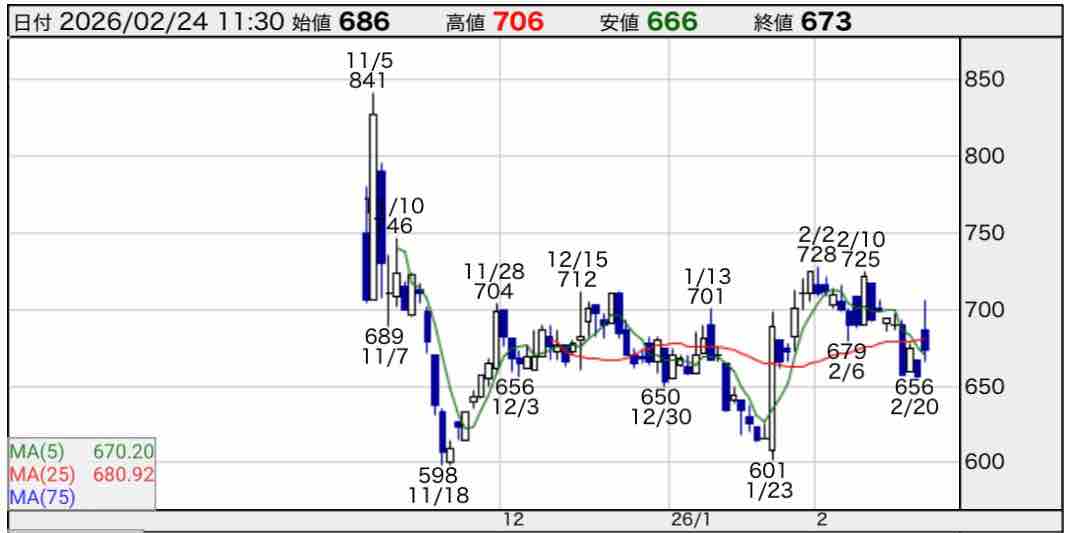 2025年11月、公開価格750円のところ初値は同じ750円でした。高値841円まで上昇したものの600円を割るところまで下落しました。