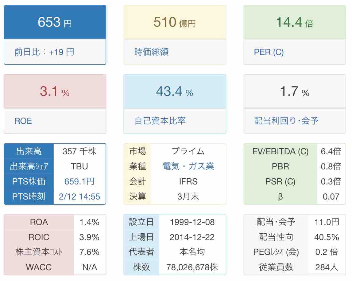 自己資本比率43%は電力業にしては高い方です。PBR0.8倍、PER14.4倍は適正水準ではないでしょうか。