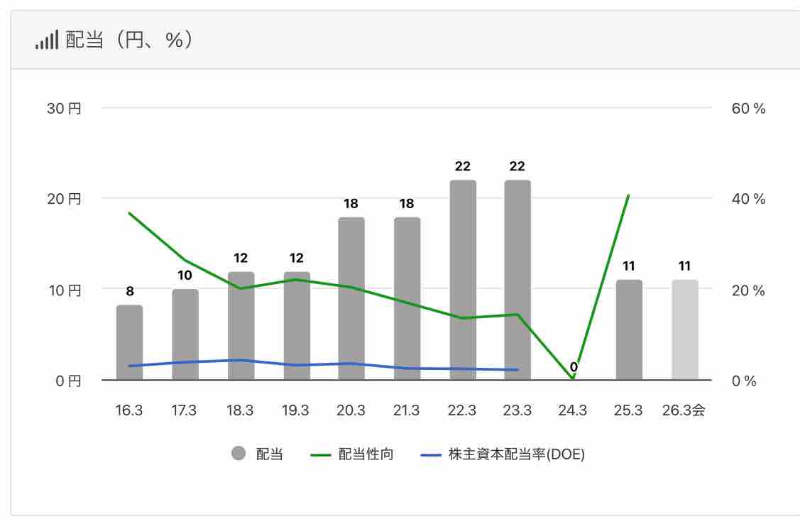 配当金の推移を見ると、2024年に赤字決算で無配転落しました💦 今期1株配当は11円を予定しています。