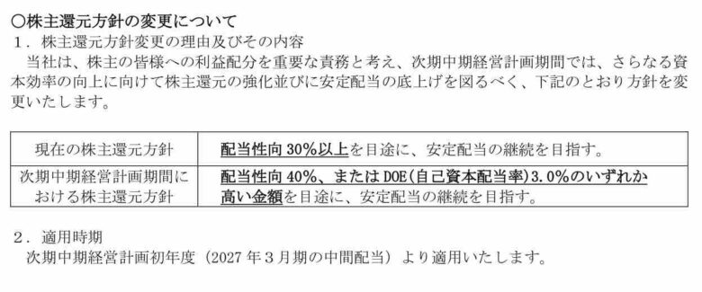 配当性向を30%→40%かDOE3%のいずれか高い方へ株主還元を強化します。現在の配当性向33%なので、もう少し増配の余地がありそうです。